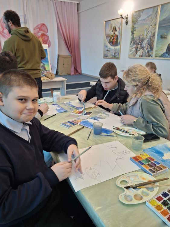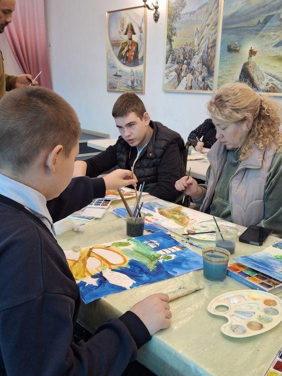 Далее участникам показали пошаговую технику изображения: сначала — мягкая прорисовка горизонта и моря, затем — очертания маяка, и только после этого — яркие детали, игра света и тени, облака и волны. Педагог адаптировал задания под возможности каждого ребёнка: кому-то помогал удерживать кисть, кому-то, а кому-то давал больше свободы в выборе цветов и образов.