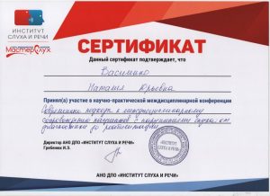 Сертификат об участии в научно-практической междисциплинарной конференции «Современные подходы к междисциплинарному сопровождению пациентов с нарушением слуха.»